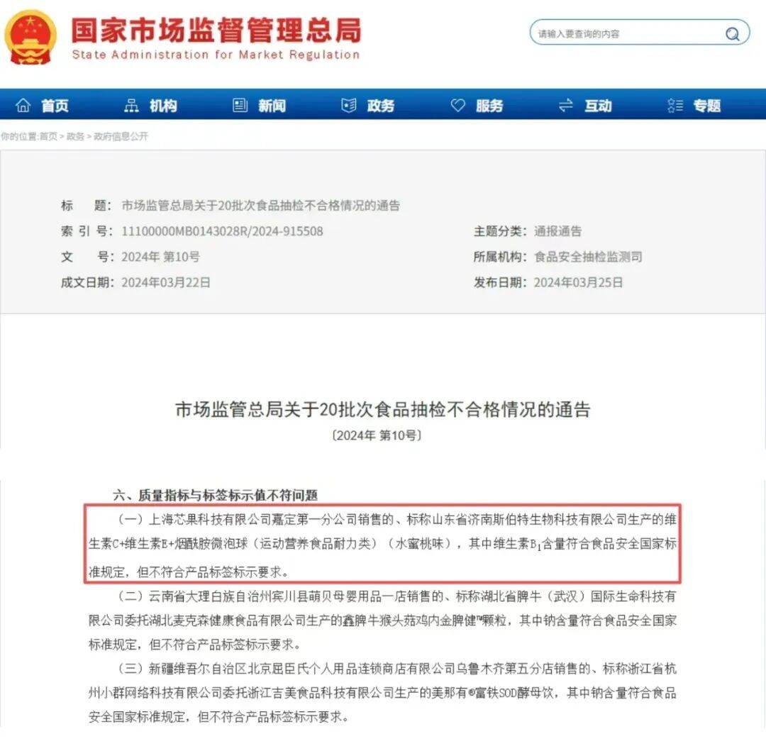 例现在年5月,国度市场监视办理总局正在一次抽检中发觉,拼多多诺特兰德旗舰店发卖的、标称济南斯伯特生物科技无限公司出产的牡蛎锌镁硒片(活动养分食物耐力类),此中维生素B₁含量既不合适食物平安国度尺度,企查查显示,济南斯伯特生物科技无限公司是山东斯伯特生物科技无限公司旗下的全资控股企业和次要出产企业。2024年3月,上海芯果科技无限公司嘉定第一分公司发卖的标称济南斯伯特生物科技无限公司出产的维生素C+维生素E+烟酰胺微泡球,被抽检出维生素B₁含量合适食物平安国度尺度,但不合适产物标签标示要求。