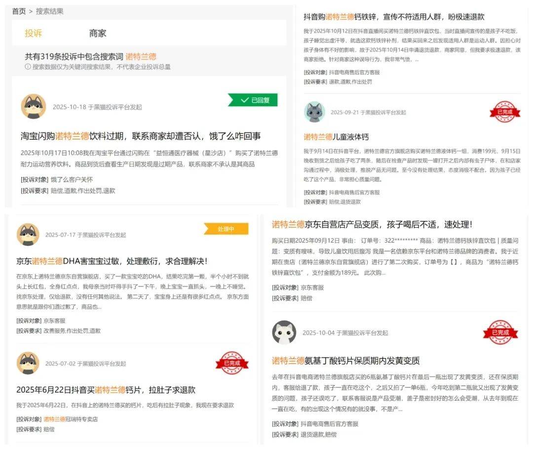 此外,正在黑猫赞扬平台上,关于诺特兰德的赞扬量已达319条,此中“成分标注不清导致不良反映”“产物变质”“产物过时”等问题不足为奇。