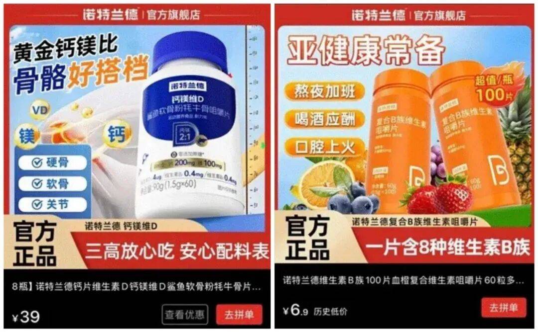 诺特兰德的大都产物仅属于“活动养分食物”,却常正在宣传中利用一些保健品话术,例如正在某电商平台诺特兰德旗舰店中,一款钙镁维D产物的告白图上写着 “黄金钙镁比,骨骼好同伴”“三高安心吃配料表”,一款维生素C产物则宣传 “亚健康常备、熬夜加班、喝酒应付、口腔上火”。因而,它被不少消费者质疑其虚假宣传、强调产物结果。